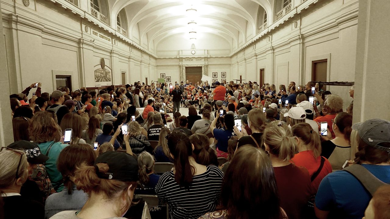 Am Donnerstag, den 12. April, wies die Lehrergewerkschaft Oklahoma Education Association (OEA) die Lehrer an, einen zweiwöchigen Streik zu beenden und zur Arbeit zurückzukehren. Als Reaktion darauf demonstrierten am Freitag tausende von Lehrern vor dem Kapitol, dem Regierungsgebäude des Bundesstaats.
