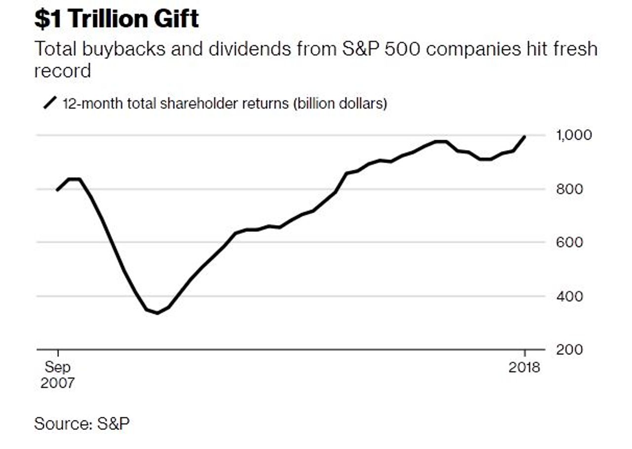 Sowohl Aktienrückkäufe als auch Fusionen und Übernahmen erreichen neue Höhen. Im ersten Quartal 2018 wurde ein Quartalsrekord von 242,1 Milliarden US-Dollar an Aktienrückkäufen verzeichnet. Diese Zahl wurde jedoch von einer Flut von Rückkäufen im zweiten Quartal noch in den Schatten gestellt, für das Unternehmen Aktienrückkäufe in Höhe von 433,6 Milliarden US-Dollar ankündigten. Der Gesamtumfang der Rückkäufe wird in diesem Jahr voraussichtlich 1 Billion Dollar übersteigen.