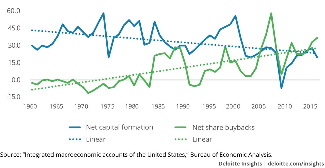 Eine Grafik von Deloitte (siehe Abb. 2) zeigt, dass die US-Wirtschaft seit den 1980er Jahren einen Trend zu sinkender Kapitalbildung in Verbindung mit expandierenden Aktienrückkäufen aufweist. Während die Daten die Anfälligkeit dieses Prozesses für Schwankungen zeigen, ist die Trendlinie klar. Diese Verschiebung hin zur Belohnung der Aktionäre auf Kosten produktiver Investitionen geht mit dem allgemeinen Niedergang der US-Wirtschaft, ihrer zunehmenden Finanzialisierung und dem Angriff auf die Arbeiterklasse Hand in Hand.