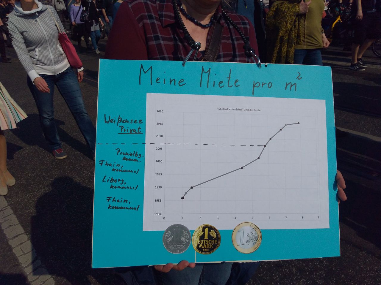 Ulrike trägt ein Poster, das den massiven Anstieg ihrer Miete in den vergangenen 30 Jahren zeigt. „Das geht von einer Mark in der DDR im Jahr 1986 – meine erste Wohnung in Berlin-Friedrichshain – bis heute. Mittlerweile bin ich bei knapp acht Euro in Weißensee. Noch kann ich die Miete bezahlen, aber man weiß ja nicht, wie es weitergeht.“ Sie wolle „auch für alle auf die Straße gehen, denen es nicht so gut geht. Es wird immer ungerechter. Vielleicht stimmt doch irgendetwas mit dem Kapitalismus nicht“, fügt sie ironisch hinzu.