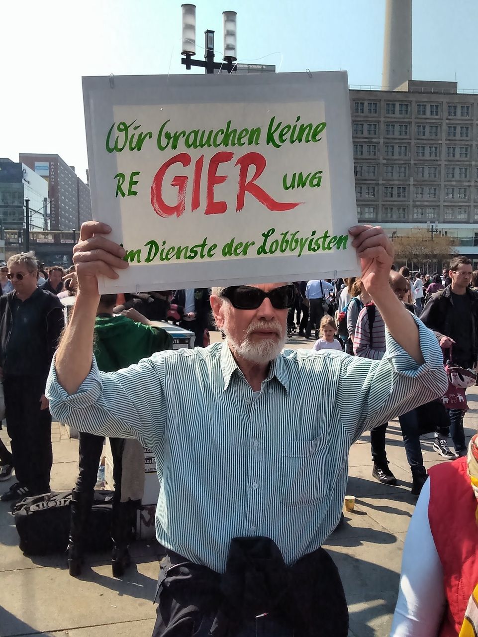 Axel denkt ganz ähnlich über die Politik hierzulande. „Wir brauchen keine ReGIERung im Dienste der Lobbyisten“, steht auf seinem Schild geschrieben. „Die Situation in Berlin ist angespannt und es wird immer aggressiver. Der neueste Trick ist, dass über fiktive Nebenkostenrechnungen, die kaum jemand nachvollziehen kann, die Mieten über den Mietpreisspiegel hinaus erhöht werden.“ Über die Rolle von SPD und Linkspartei ist er sich wie die meisten Demonstranten bewusst. „Unser Party-Weltmeister Wowereit und der rot-rote Senat haben da kräftig mitgemischt. Die sitzen ja alle in der Finanzclique mit drin“.