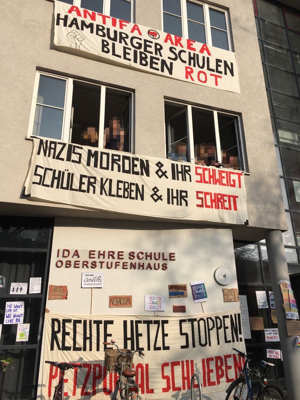 Am 29. März hängten Schüler der Ida Ehre Schule Transparente an die Fassade des Oberstufenhauses. Eines lautete: „Nazis morden & ihr schweigt, Schüler kleben & ihr schreit“.