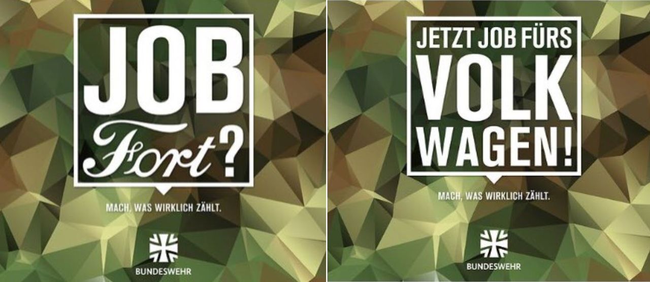 Kaum hatten die Ford-Werke bekanntgegeben, dass sie in Köln und Saarlouis 5400 Stellen vernichten, zog ein Bundeswehr-Transporter mit Werbewand von Werkstor zu Werkstor. „JOB Fort? Mach was wirklich zählt“, stand darauf. Das Wort „Fort“ war in den Lettern des Ford-Logos geschrieben. Parallel dazu erschien die Anzeige auch auf der Titelseite des Kölner Express. Nach dem gleichen Muster hieß es vor den Toren von VW in Wolfsburg: „Einen Job fürs Volk wagen“. Auch bei VW sollen bis zu 7000 Stellen abgebaut werden.