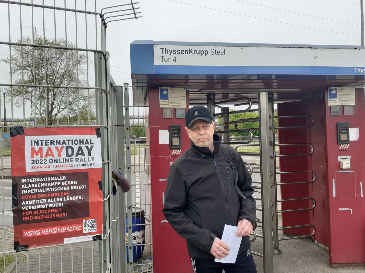 Beim Schichtwechsel vor dem Thyssenkrupp-Tor in Duisburg nehmen praktisch alle Arbeiter den Aufruf des IKVI zum Online-Mayday, „Für die internationale Einheit der Arbeiterklasse gegen Kapitalismus, nationalen Chauvinismus und Krieg!“ interessiert mit. Einstimmig sprechen sich die Stahlarbeiter, die mit uns sprechen, gegen Krieg aus.