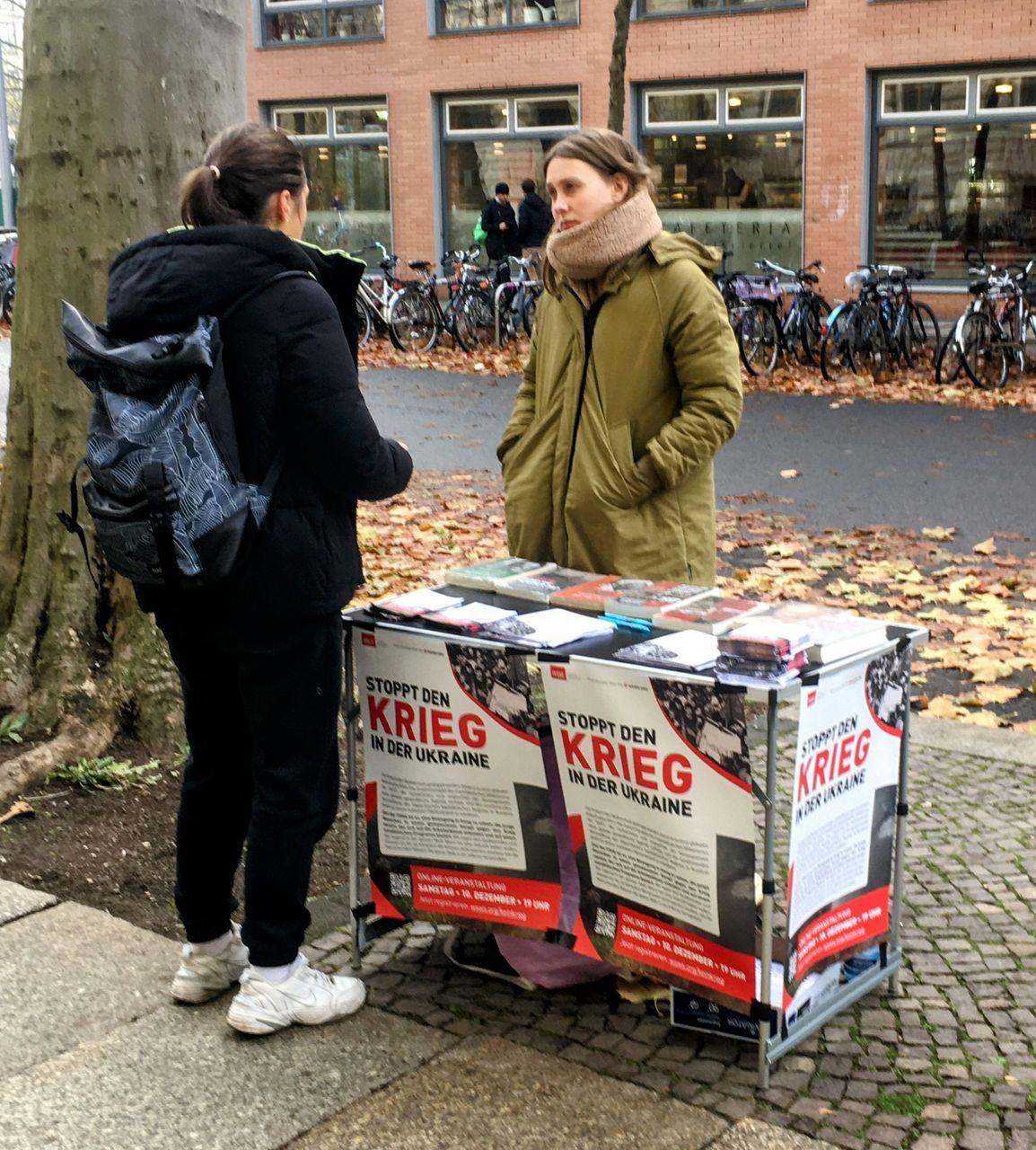 Oleksandra kommt aus der Ukraine und studiert an der Leipziger Hochschule HTWK International Management. Als sie die Plakate der IYSSE sieht, kommt sie direkt auf unseren Büchertisch zu. „Es gibt russische Propaganda und es gibt ukrainische Propaganda“, stellt sie fest. „Ich glaube nicht, dass die ukrainische Bevölkerung die Nato insgesamt befürwortet oder dass sie die USA und deren Meinung unterstützen.“