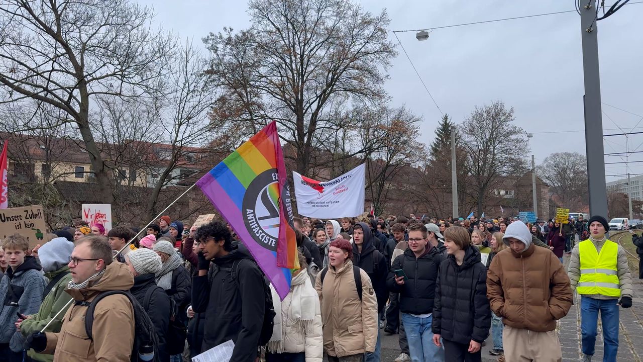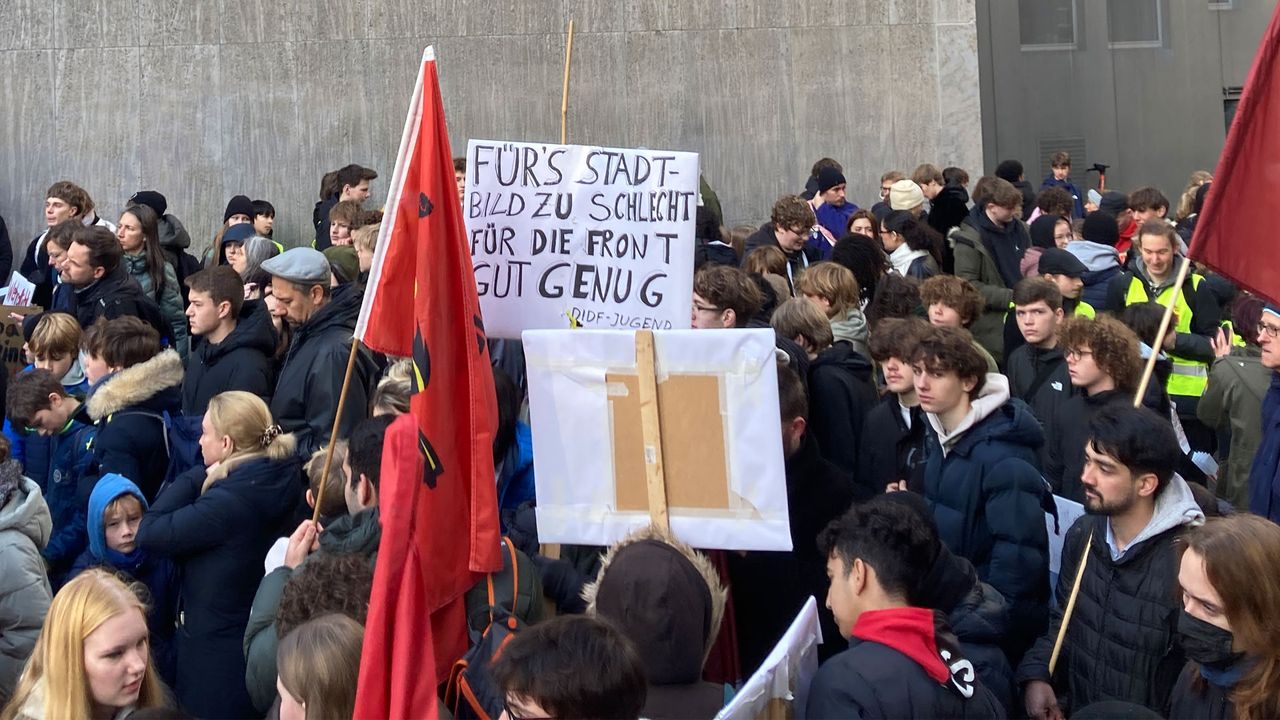 Allein in Sachsen demonstrierten rund 2000 Schülerinnen und Schüler. „Hoch mit der Bildung, runter mit der Rüstung“, riefen sie in Dresden. „Wir sind kein Kanonenfutter!“ oder „Merz an die Front“ stand auf selbstgebastelten Plakaten in Essen. Ein Spruch rief die ausländerfeindliche Hetze des Bundeskanzlers in Erinnerung: „Für’s Stadtbild zu schlecht, für die Front gut genug.“