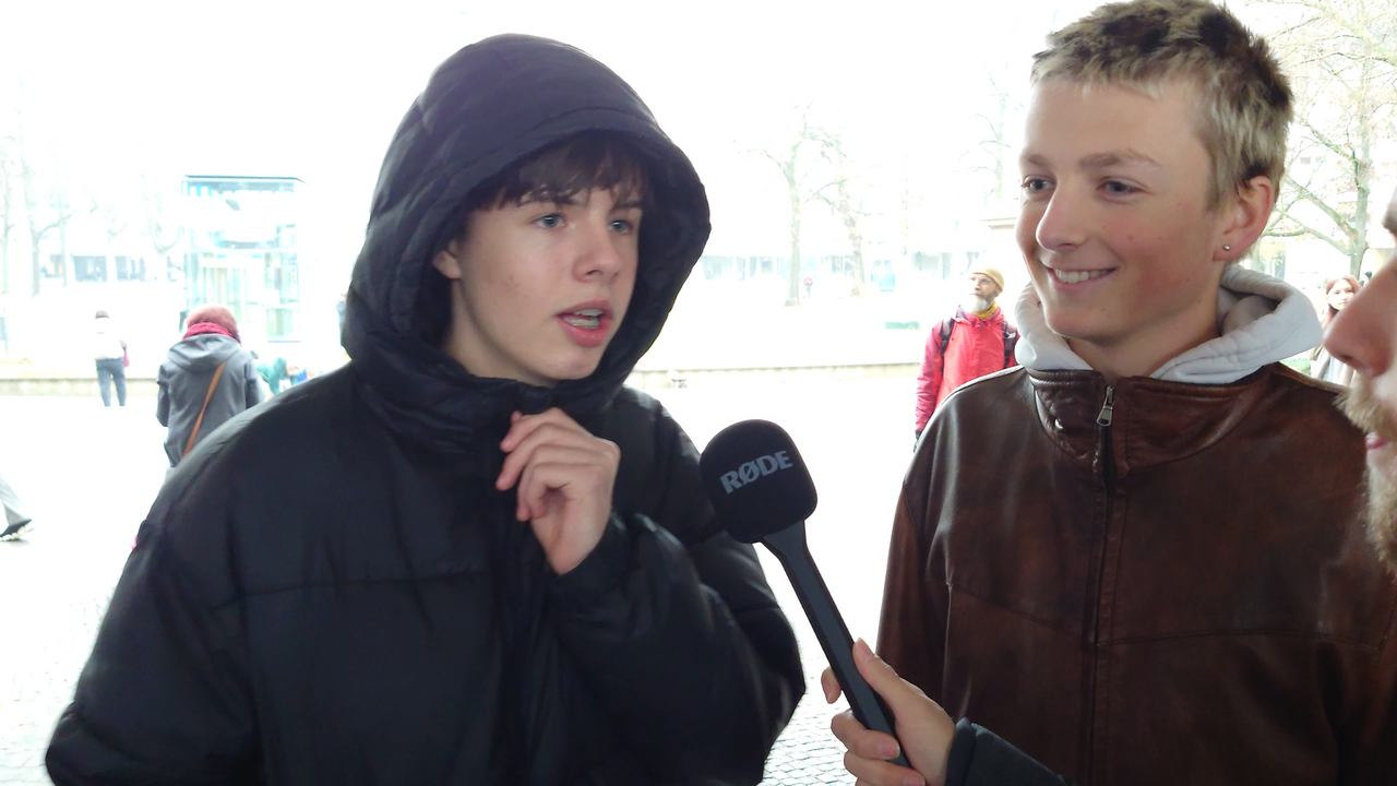 Blagovest und Leon gehen auf ein Berufskolleg in Gladbeck und sind extra zur Demonstration nach Essen gekommen. Der 20-jährige Blagovest sieht die Ursache für die Wiedereinführung der Wehrpflicht vor allem darin, dass Politiker und Banken im Krieg mehr Geld verdienen wollen. Leon (18) sagt, die etablierten Parteien würden keine Alternative mehr bieten: „Die gleichen Leute sind immer oben. Also egal, welche Partei, die machen immer das Gleiche. Es passiert immer noch was Schlimmeres, was gegen die Menschheit geht. Und das macht einem natürlich sehr Angst.“ Leon betont: „Es geht um unsere Zukunft als Menschheit.“ Kommt es zu einem großen Krieg, würden alle sterben – „egal, was für eine Hautfarbe du hast oder wen du geheiratet hast“.