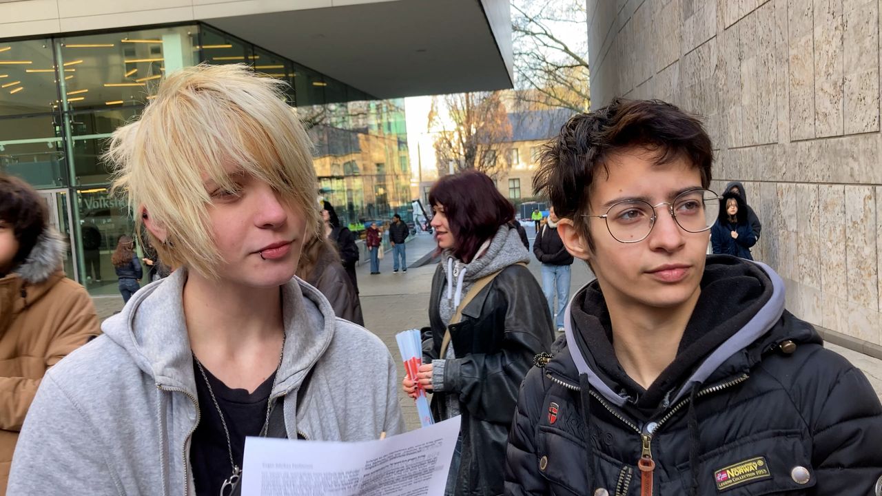 Der 15-jährige Bilal, der Klassensprecher einer 10. Klasse an einer Essener Gesamtschule ist, sagt: „Jetzt sehen wir, dass sie sehr viel Geld ins Militär reinwerfen und nicht in die Ausbildung zum Beispiel, das sollten wir auf jeden Fall ändern.“ Schüler in seiner Klasse würden schon seit Jahren dagegen protestieren, dass sie selber die Toiletten sauber machen müssen. Die Stimmung unter seinen Mitschülern sei mehrheitlich gegen die Wehrpflicht, aber: „Die meisten haben sich heute nicht getraut, mitzukommen, weil der Schulleiter es uns verboten hat.“