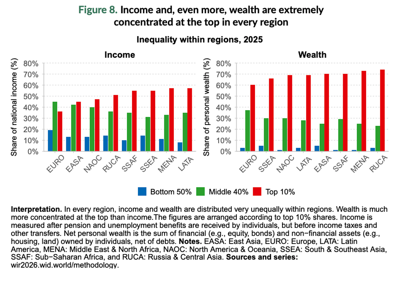 In Bezug auf das Einkommen stellt der Bericht ein Ausmaß an Ungleichheit fest, das kaum zu begreifen ist. Laut seiner Analyse „verdienen die obersten 0,1 % genauso viel wie die unteren 50 % insgesamt. Das bedeutet, dass eine Gruppe von Menschen, die nicht größer ist als die Bevölkerung Singapurs, das gleiche Einkommen erzielt wie die Hälfte der Weltbevölkerung”. An der Spitze „verdienen die obersten 0,000001 % (etwa 5.600 Menschen) im Durchschnitt ein Achtel dessen, was die unteren 50 % zusammen erhalten. Mit anderen Worten: Eine kleine Konzerthalle voller Menschen hat ein Jahreseinkommen, das mit dem von Milliarden von Menschen vergleichbar ist.“