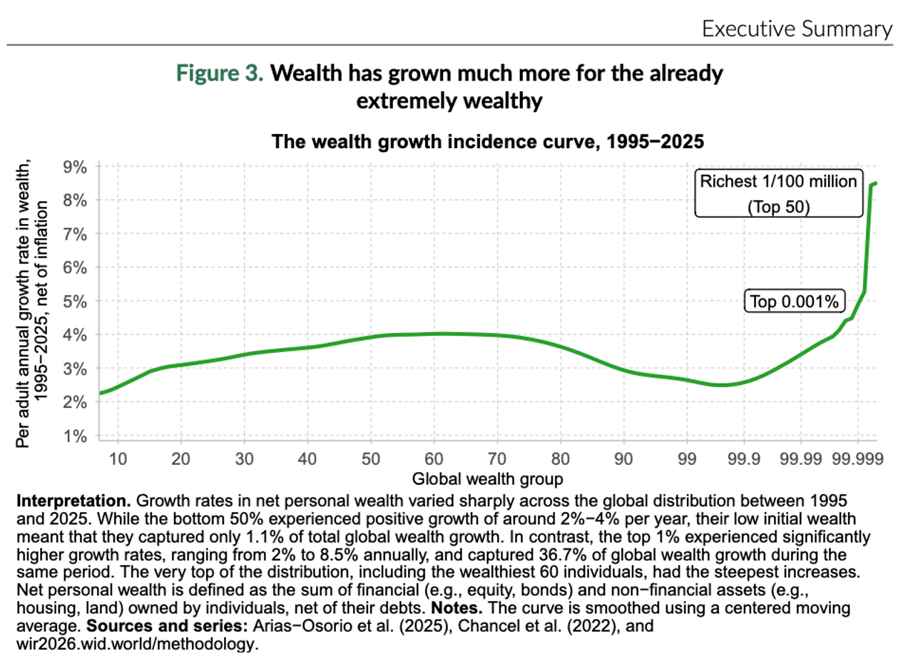 Dem Bericht zufolge ist der Anteil der reichsten 0,001 Prozent am weltweiten Vermögen seit 1995 von 4 Prozent auf 6 Prozent gestiegen, während die untere Hälfte der Weltbevölkerung nur 2 Prozent kontrolliert. Multimillionäre haben ihr Vermögen in den letzten drei Jahrzehnten um etwa 8 Prozent pro Jahr gesteigert, fast doppelt so stark wie die untere Hälfte der Bevölkerung.