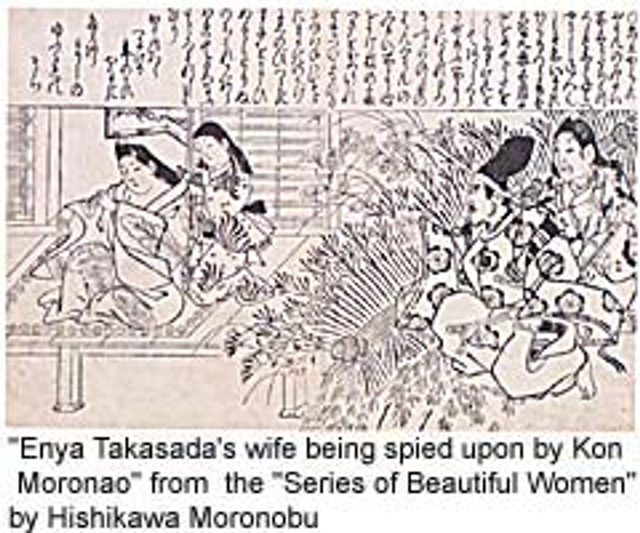 Edo artist Hishikawa Moronobu (c.1618-1694), who came from a family of textile producers and designers, is regarded as a founder of ukiyo-e. The exhibition has a single monochrome woodblock print entitled "Enya Takasada's wife being spied upon by Kono Moronao" from Moronobu's Series of Beautiful Women published in 1683. The image, accompanied by a poem, captures the longing of Moronao who was to be executed for his amorous activities.