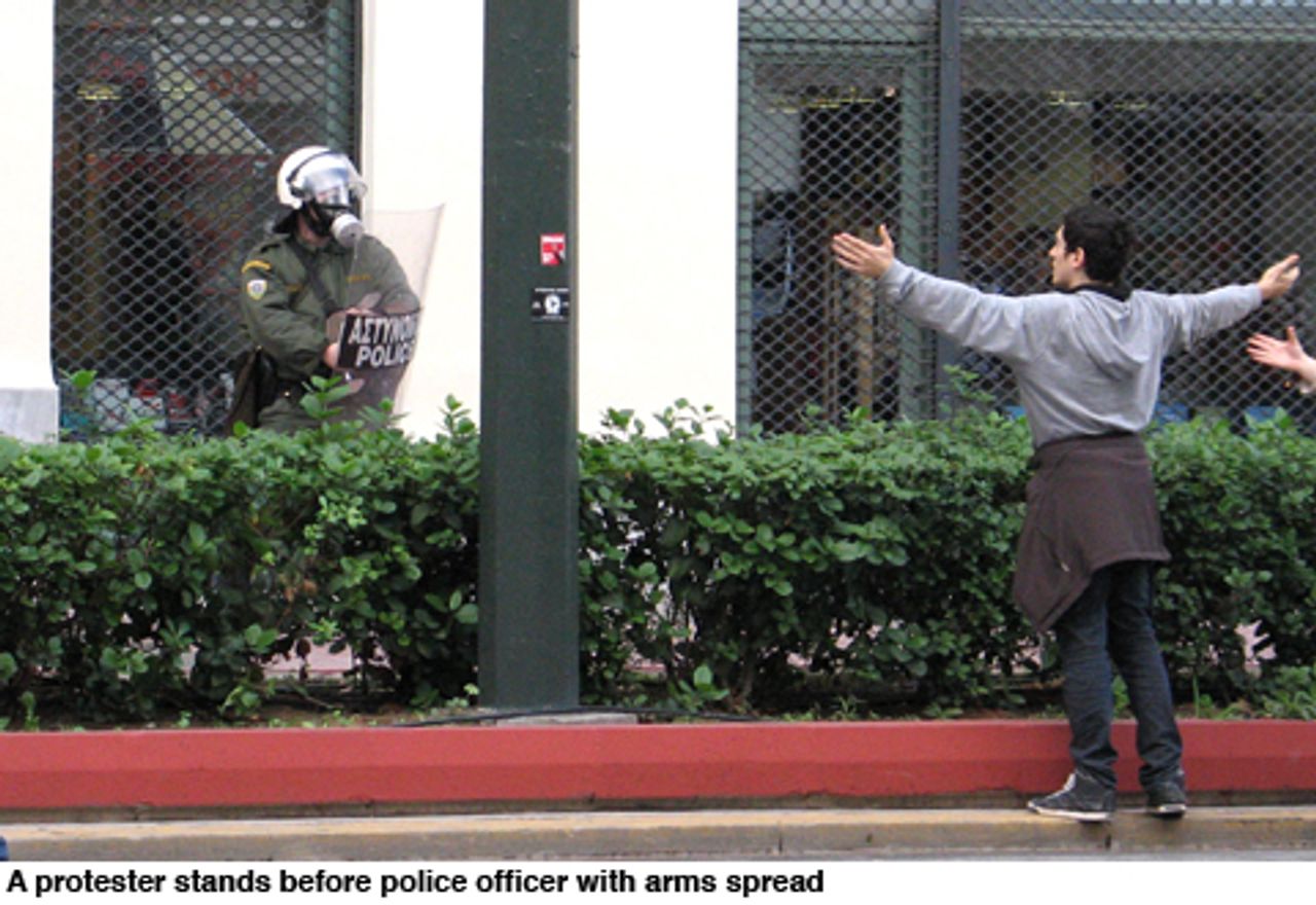 After a while the police provoked the crowd by picking out and arresting certain individuals. The crowd of demonstrators held their ground. Having had no success, the police sprayed the crowd with tear gas and, wearing gas masks, attacked the protesters. Fortunately, those caught by the police were able to escape with the help of other students and some older men who yelled at the police officers (who were also quite young) that they "should be ashamed of themselves."