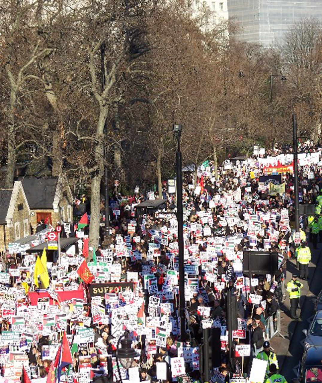 Several people were injured when riot police began hitting and kicking protesters in an underpass in Piccadilly. In the evening, police officers penned in several thousand demonstrators who were protesting outside the Israeli embassy and began hitting them with shields and batons, leaving even more wounded. (YouTube video)