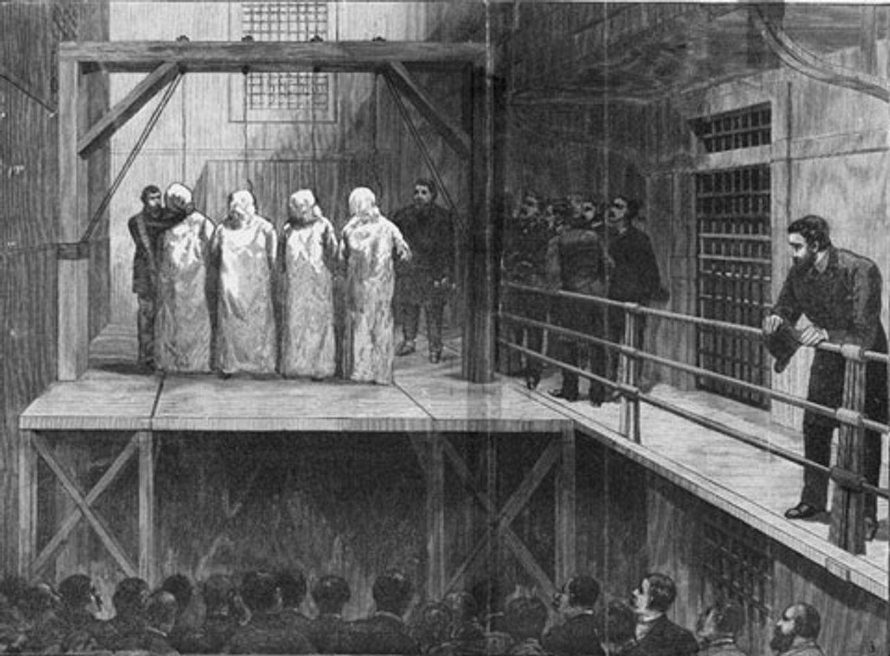 The hanging on "Black Friday"At 11:30 a.m. on the morning of November 11, “Black Friday,” Albert Parsons, August Spies, Adolph Fischer and George Engel were led to the scaffold. Paul Avrich describes the scene: “The witnesses stopped talking when they heard the sound of feet on the iron stairway. One after another the prisoners appeared, each guarded by a deputy. Spies at the head, erect and firm, stepped to his place on the scaffold and turned towards the spectators.