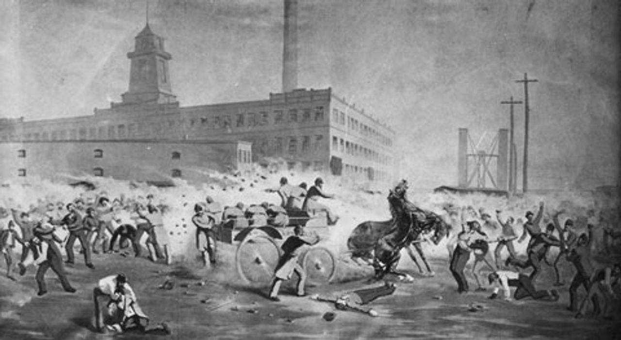 A depiction of the conflict outside the McCormick Reaper Works on May 3, 1886, where several workers were killed by police.The ruling class was preparing for violence on the first May Day, but there was none. Instead, May 1,1886, was a historic culmination of the struggle for the eight-hour day.