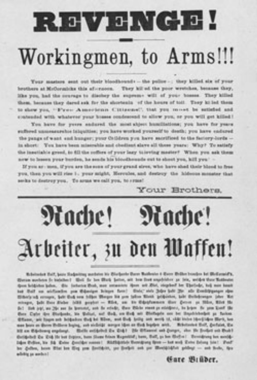 “REVENGE! Workingmen, to arms!!! Your masters sent out their bloodhounds—the police; they killed six of your brothers at McCormicks this afternoon. They killed the poor wretches, because they, like you, had the courage to disobey the supreme will of your bosses. They killed them, because they dared ask for the shortening of the hours of toil. They killed them to show you, ‘Free American Citizens,’ that you must be satisfied and contented with whatever your bosses condescend to allow you, or you will get killed!
