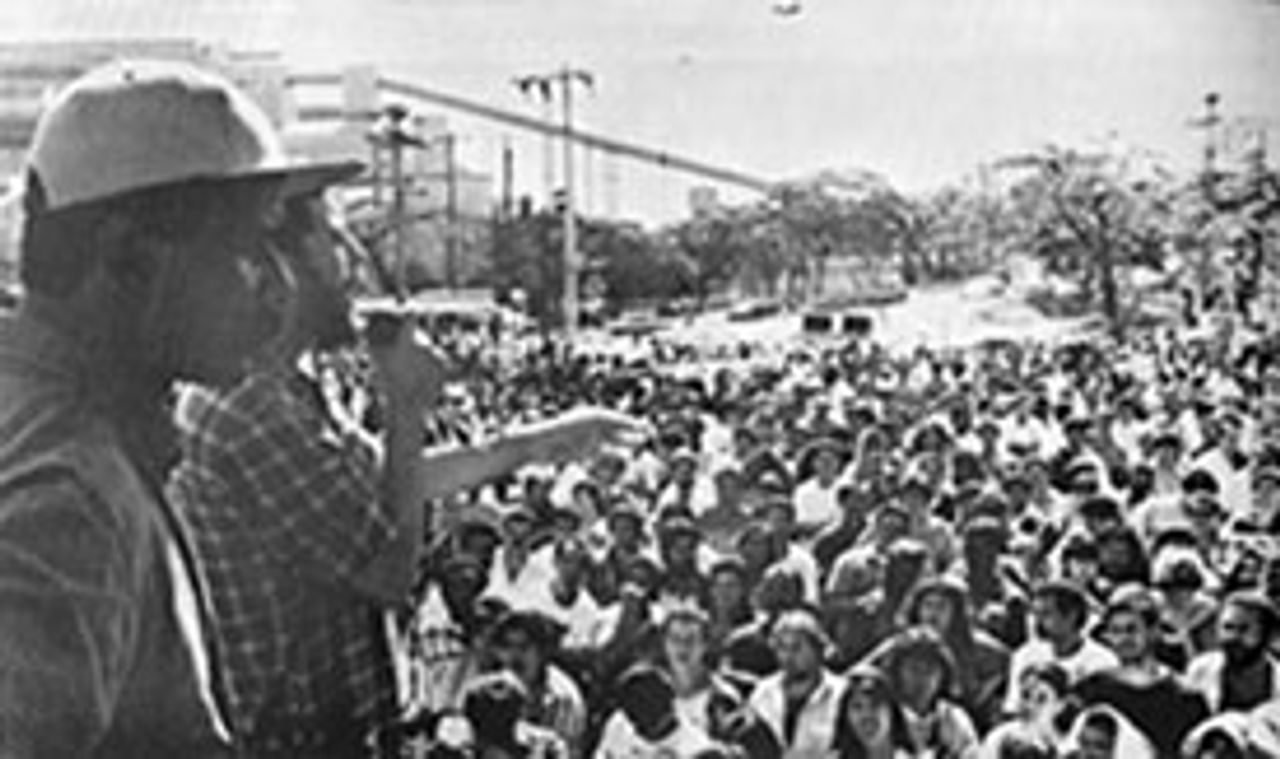 A rally of Brazilian metalworkers in 1990A growing crescendo of strikes and occupations in Brazil threatened the new government of Jose Sarney, who had been installed after the death of Tancredo Neves. Neves had won the first presidential elections in Brazil after a 21-year military dictatorship.