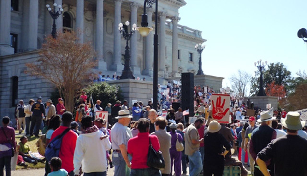 The organizations sponsoring the rally included the AFL-CIO, the S.C. Alliance for Retired Americans, the S.C. Education Association, the S.C. Employees Association, S.C. HIV/AIDS Care Crisis Task Force, S.C. NAACP, and the South Carolina Progressive Network. None of these groups demanded an increase in income and property taxes on the wealthy. Instead, they confined their demands to the repealing of specific tax exemptions.