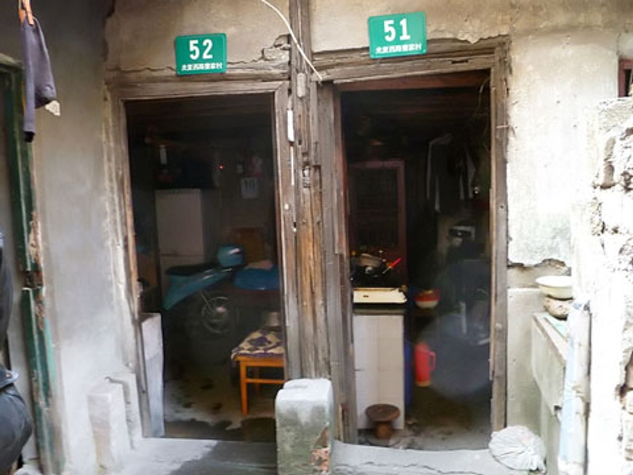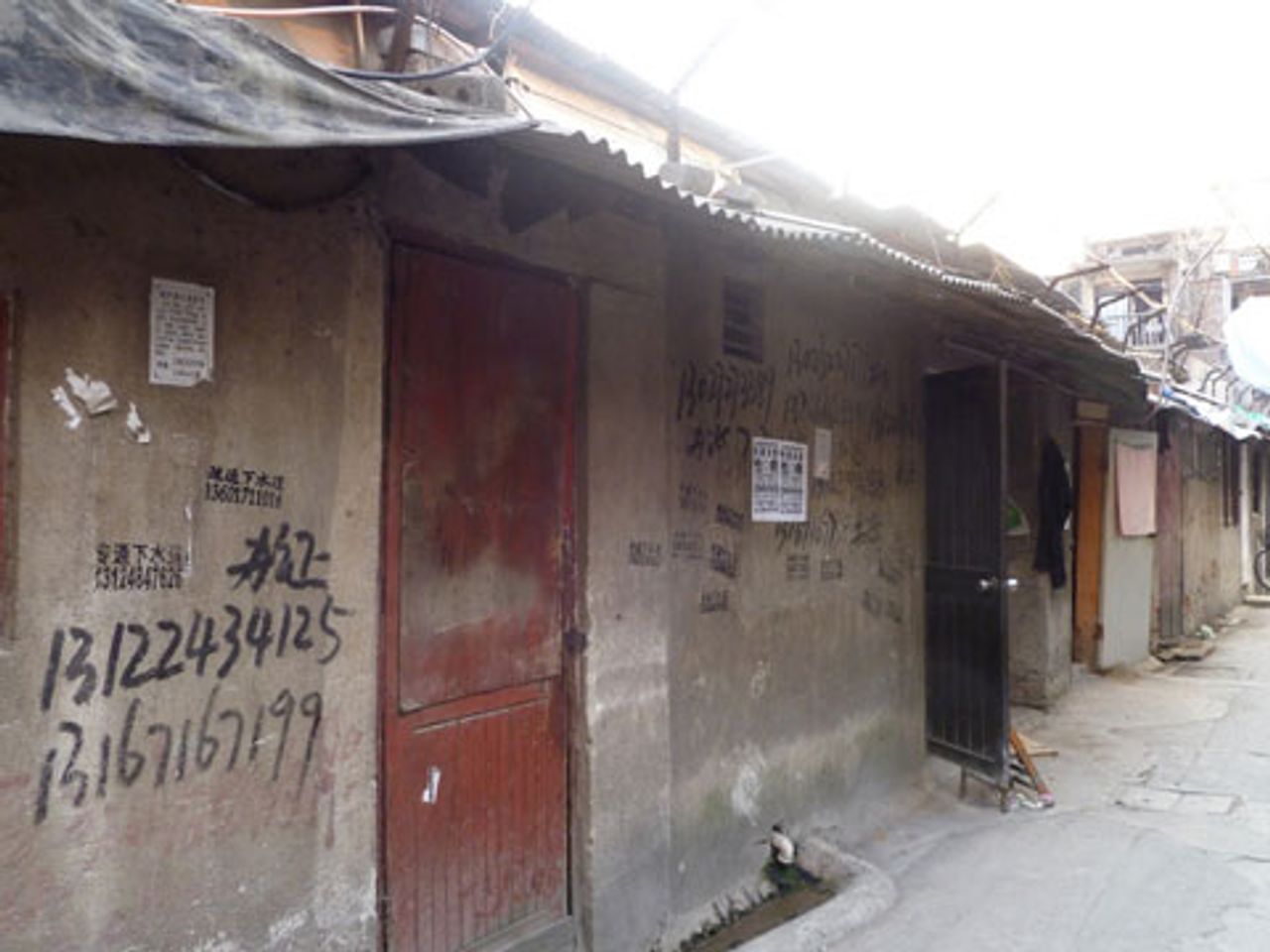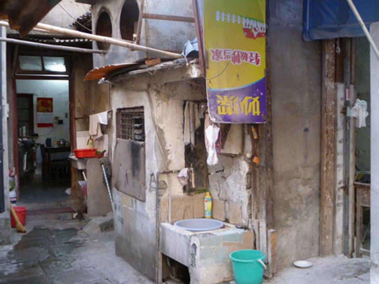 Just a stone’s throw from Shanghai’s central railway station, on Xhongxin Road, there is crowded slum housing, accessible only on foot, with shacks and shelters added on to existing buildings, often with outside stone sinks and no bathroom. Residents must use potties, whose contents are thrown into the gutters, or use the public neighbourhood toilets, a common sight in China’s cities.