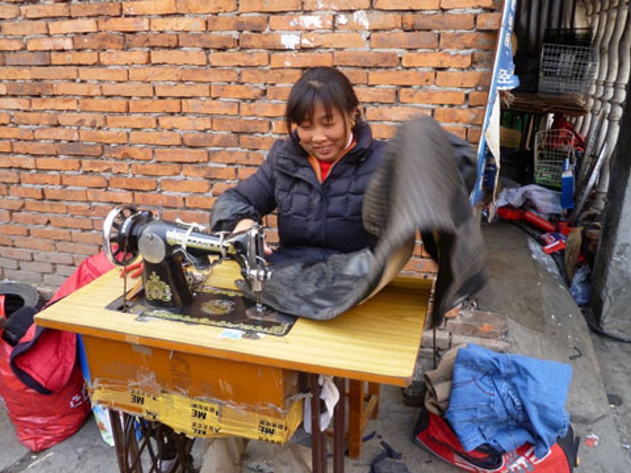 A worker sewing outside
