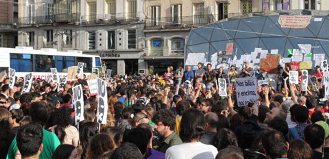 A section of the protest in Puerta del Sol square in Madrid on FridayThe Catalan riot police attacked at around 6.45 am, after protesters staged a sit-in to stop a convoy of cleaning trucks leaving the square after dismantling their encampment, under police supervision. Demonstrators chanted, “They shall not pass!”