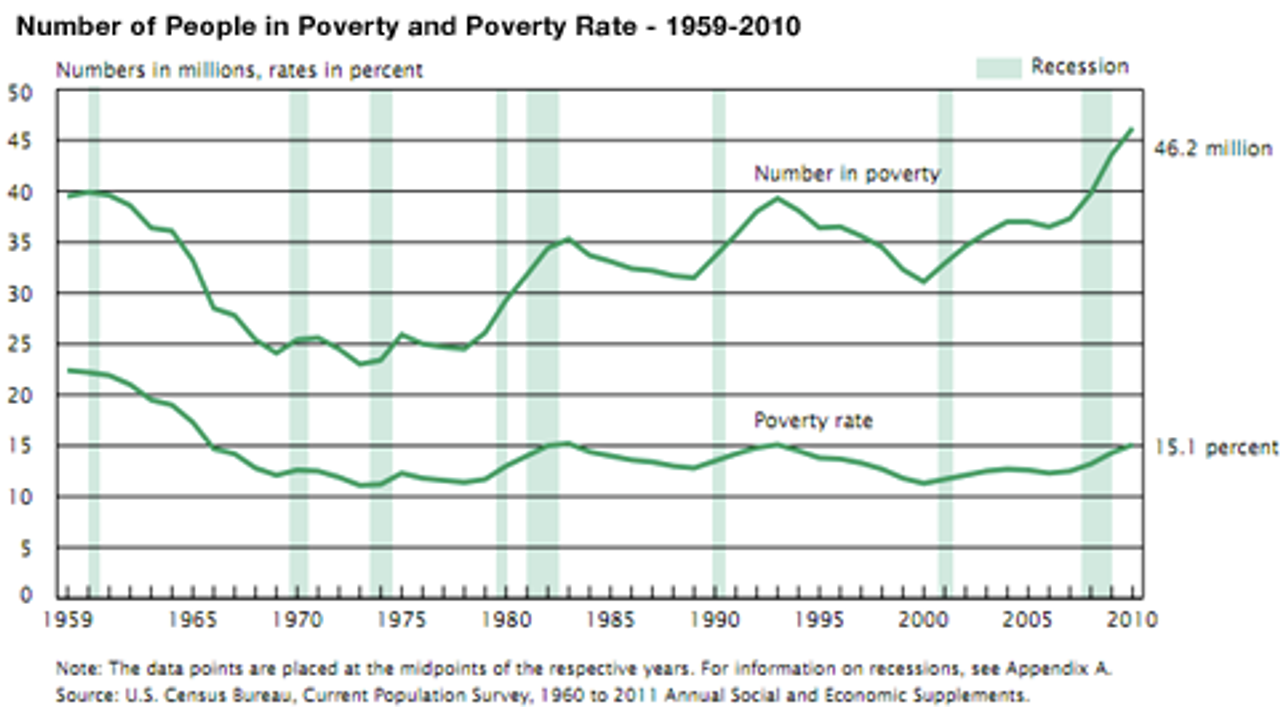 The total number of people in poverty is equivalent to the combined population of the 50 largest cities in the United States. There are more people in poverty in the US in 2010 than during any year on record going back to 1959.