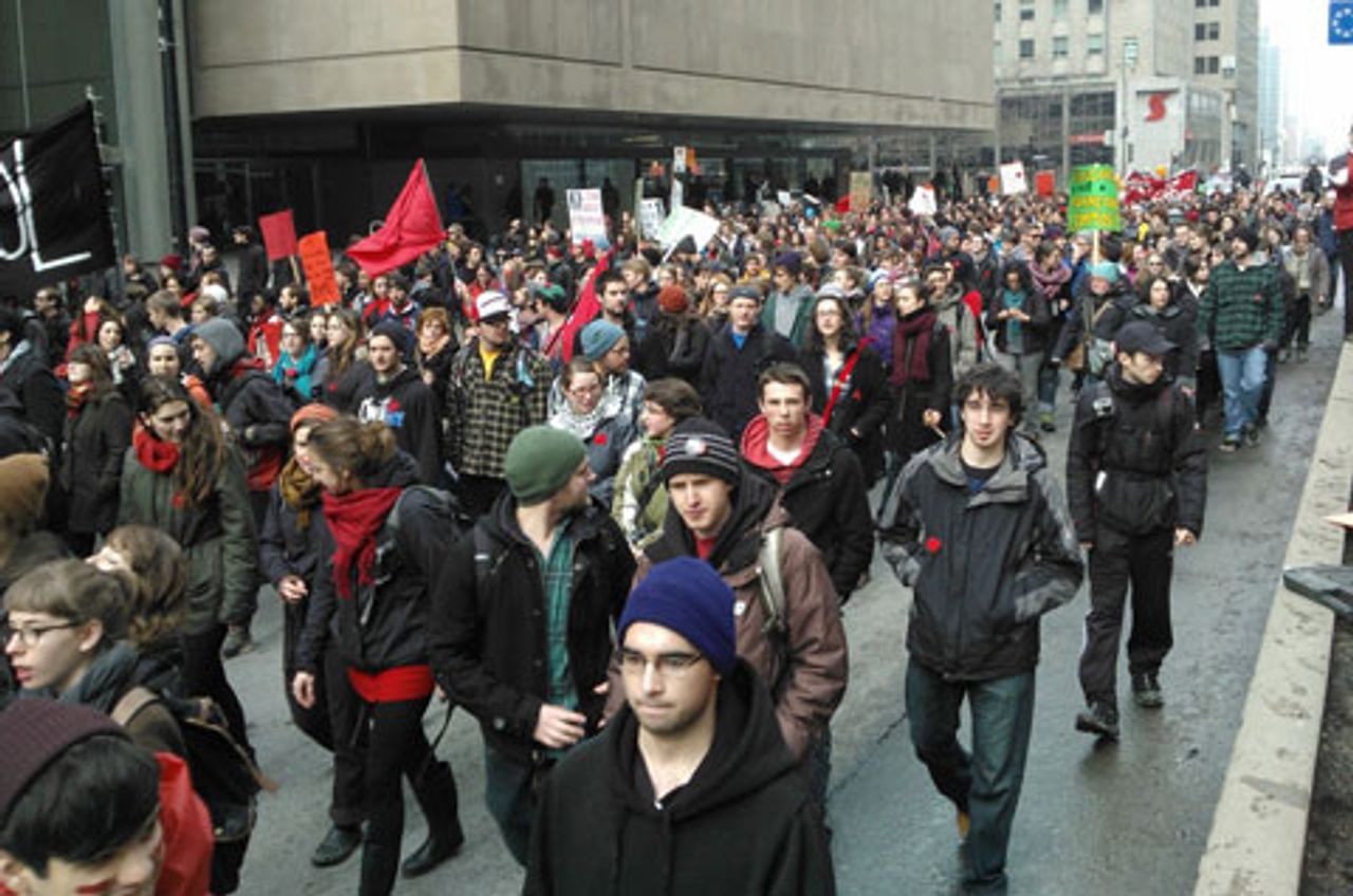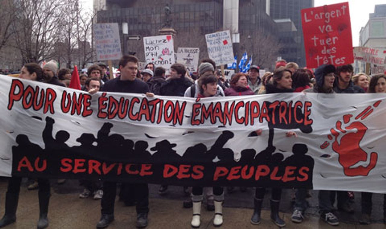 Striking Quebec students demonstrating in Montreal last Tuesday. The banner reads, “For an emancipatory education in the service of the peoples.”The students are demanding that the provincial Liberal government of Jean Charest withdraw its plan to raise university tuition fees by 75 percent over the next five years. There is a widespread popular support for this demand, as part of a more general, albeit to this point inchoate, opposition to the Charest and federal Conservative governments’ “austerity” agendas of social spending cuts, privatization, and new and increased user fees and regressive taxes.