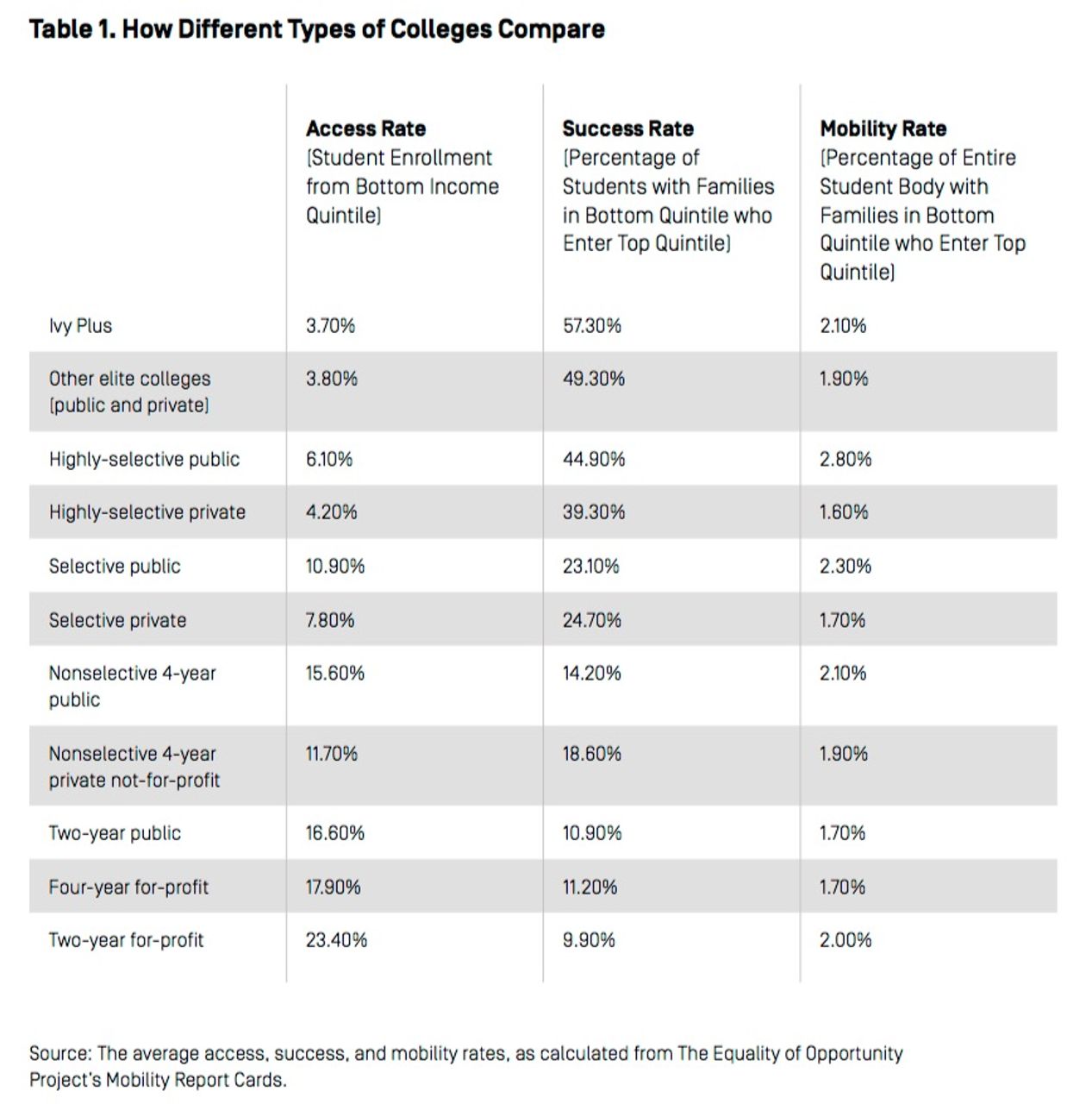 The table above, taken from the report, shows the access and success rates, expressed as percentages of total enrollment. Access rates are the percentage of students whose families are in the bottom quintile, while success rates are the percentage of students with families in the bottom quintile who eventually enter the top quintile.