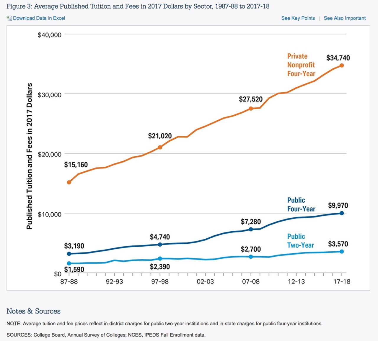 The rising tuition that can be seen since 2013 in the US will only put higher education further out of the reach of the working class. The graph above is derived by the College Board, showing the rise in tuition costs from the 1987-88 academic year to 2017-18. The dollar values here are shown in 2017 dollars. Despite a few twists and turns, the general direction of these lines is obvious—tuition is rising steadily as time goes on. This trend has continued, regardless of the President in office.
