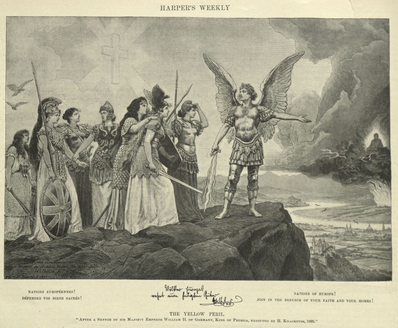 In 1895, the Kaiser commissioned a drawing to popularize the concept, titled “Nations of Europe, defend your faith and your homes!”
