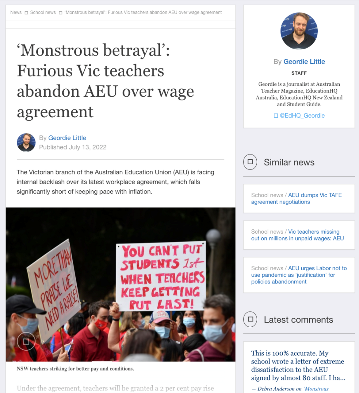 EducationHQ is an online publisher that also prints several magazines, including Australian Teacher, which is widely distributed in school staff rooms. Its July 13 article (paywalled but available here), “‘Monstrous betrayal’: Furious Vic teachers abandon AEU over wage agreement,” interviewed several teachers who had quit the union over the sell-out deal.