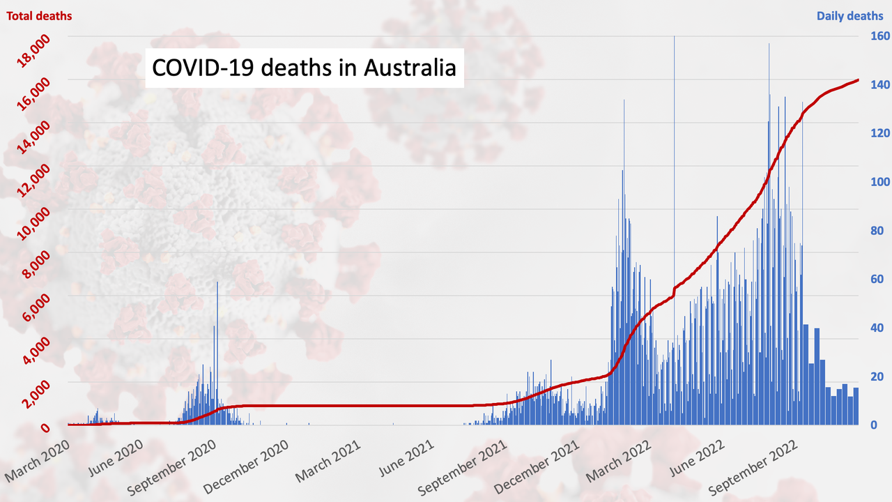 In the week ending Friday, 108 people died from COVID-19, up from 83 the previous week. A further 13 fatalities in Victoria were reported today, bringing the country’s total to 15,980.