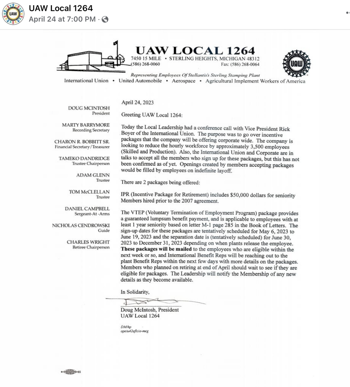 According to McIntosh, signup dates for the packages will be from May 6 to June 19, and “separation dates” will be from June 30 to December 31, 2023. The packages are being mailed over the next couple of weeks. The job cuts are being implemented through a joint UAW-management entity called the “National Job Security, Operational Effectiveness and Sourcing Committee.”