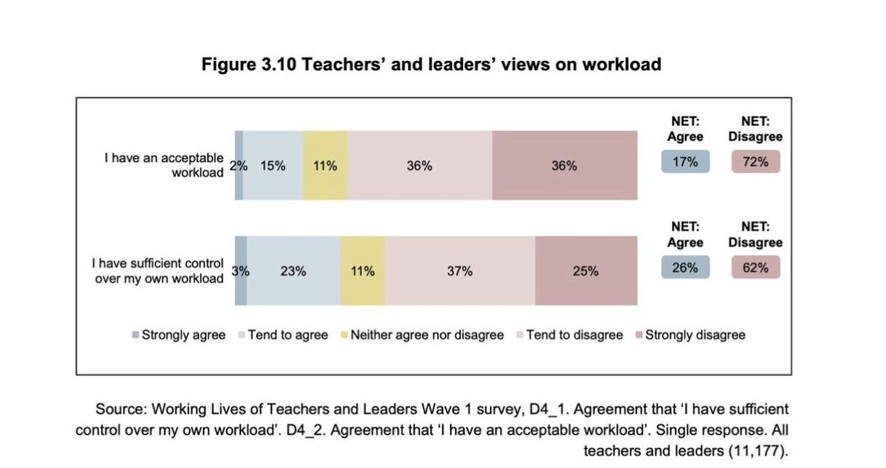 The most common reason was workload (92 percent), followed by government meddling (76 percent) and pupil outcomes or Ofsted inspections (69 percent). Many educators did not feel valued by society (69 percent).