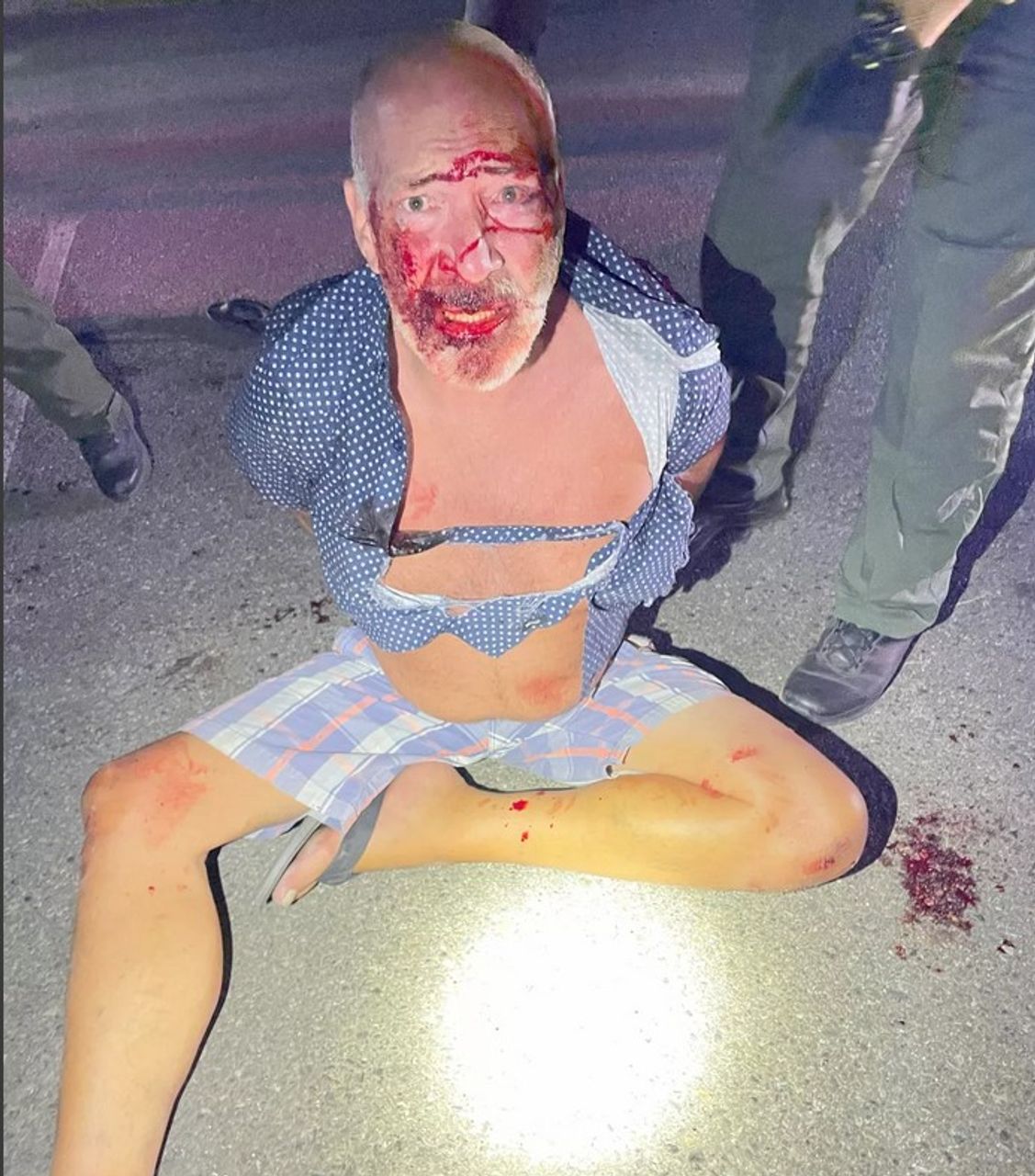As more police arrive a bloody Hinton was handcuffed and left on the pavement.