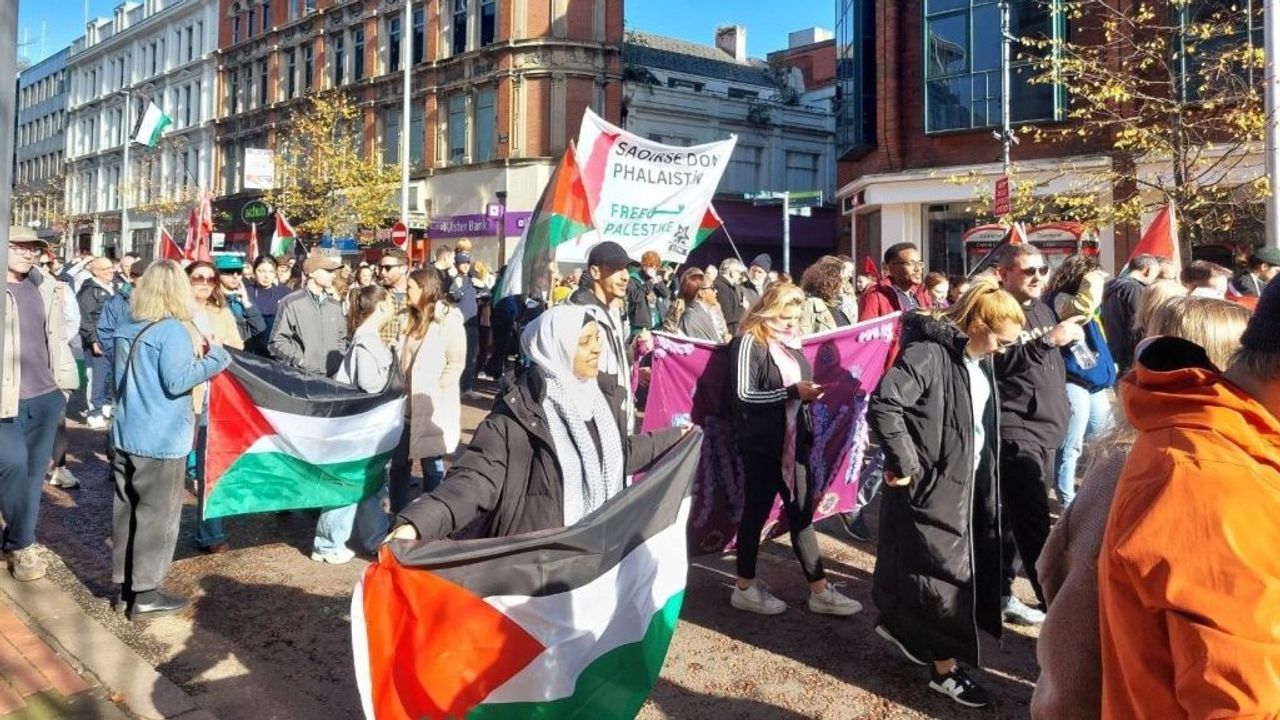 In Belfast, capital of British-controlled Northern Ireland, on successive weekends, thousands of people have marched through the city centre. Last Saturday, in an event organised by Belfast Stands with Palestine, protestors marched from Belfast City Hall to the BBC’s Broadcasting House in Ormeau Avenue before hearing speeches denouncing US President Joe Biden, Britain’s Rishi Sunak and the European Union’s (EU) Ursula von der Leyen.