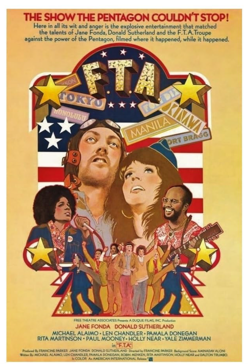 F.T.A., an acronym borrowed from G.I. newsletters, was understood among disaffected military grunts to signify “Fuck the Army,” although it was jokingly euphemized as “Free the Army” (or as the Free Theater Association). Formed by Fonda, Sutherland, and other like-minded performers in 1971 as an alternative to Bob Hope’s official patriotic entertainment for the troops, F.T.A. was an “anti-military, anti-war revue,” a kind of “political vaudeville” show composed of two hours of “songs, sketches, dances, readings and visual gags whose specific message is ‘You, the enlisted man, can end this war by simply refusing to fight’” … It is not surprising that the troupe was trailed by FBI and CIA agents wherever they went, and that they were banned from appearing on military bases and met with visa problems upon landing in the airport in Japan …