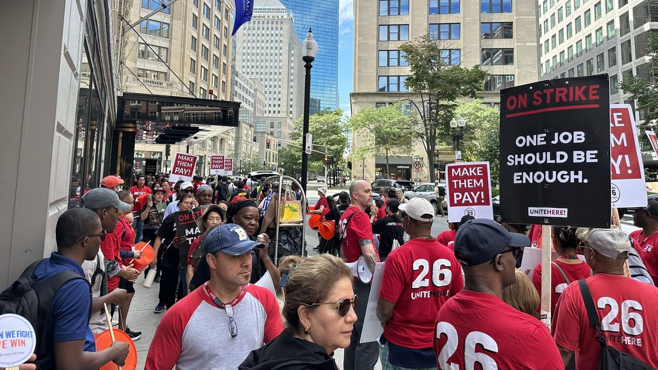 The workers, members of UNITE HERE, walked out against 25 hotels at some of the largest hotel chains, including the Hilton, Hyatt and Marriott, after the previous contract expired at midnight on Saturday.