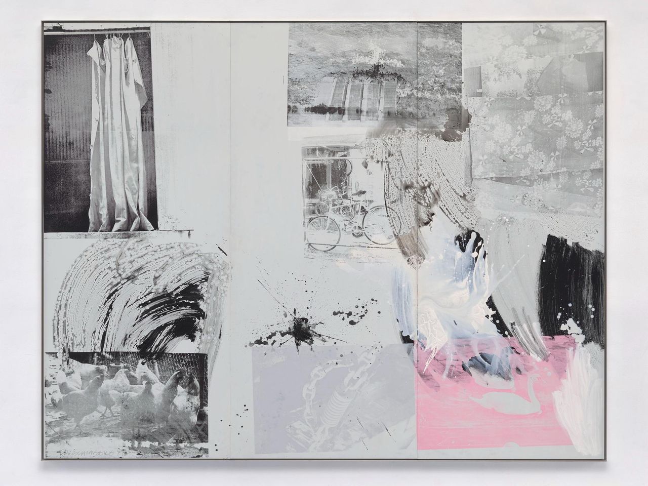 He often returned to the silkscreen technique, experimenting with supports other than canvas. Rauschenberg painted “Easter Lake (Galvanic Suite)” (1988) on galvanized steel. Composed in three rough columns, the painting includes images of a curtain, chickens, bicycles, printed fabric and swans. Its palette comprises white, airy grays and black, while the swans are rendered against a faint pink background. A large area of negative space adds to the painting’s airiness. The steel gives the images harder edges and endows Rauschenberg’s gestural smears and splashes with a certain coldness.