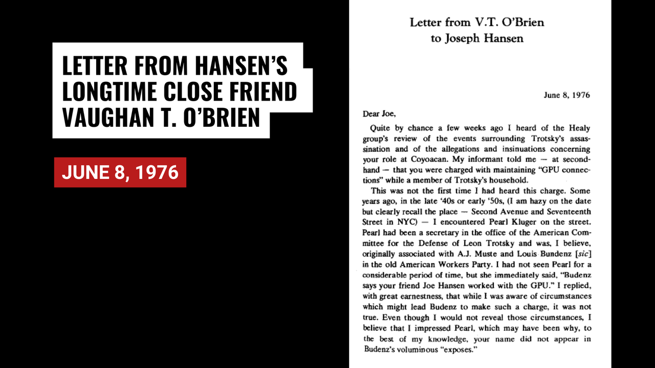 That letter dispositively confirmed the testimony of O’Brien given at his prior deposition that Louis Budenz’s friend Pearl Kluger, at around the time of the publication of Budenz’s books, and the time of the SWP’s Control Commission as to Sylvia Franklin, had told O’Brien that Budenz had said that “your friend Joseph Hansen worked with the GPU.”