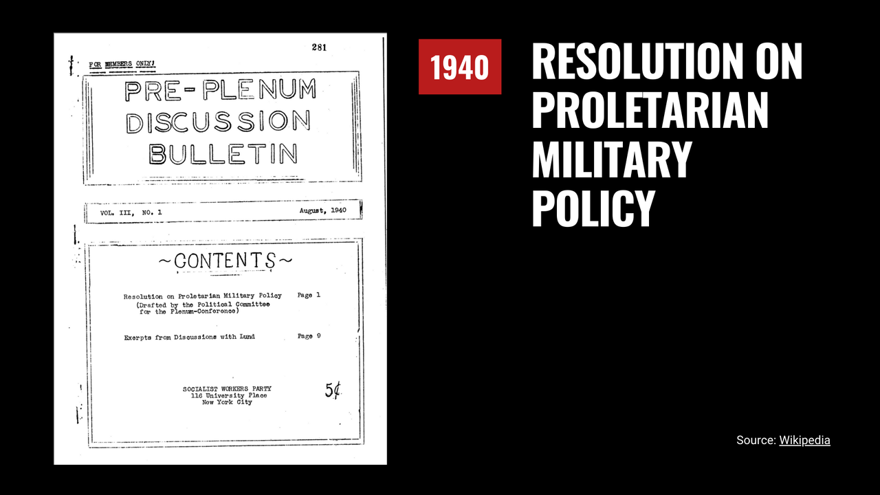 Comrades know the proletarian military policy was developed out of a series of discussions with the SWP leadership led by Trotsky in the final months of his life; it was aimed at developing a series of transitional demands through which the SWP could cut a path to the working class, and develop its independence from the bourgeoisie, under conditions of a mass mobilisation for war.