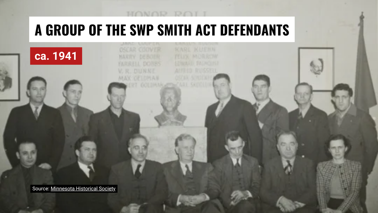 A year after the law was passed, 29 members of the Socialist Workers Party were charged, breaking down into a group of the party’s national leaders based in the SWP’s headquarters in New York City, and a group of SWP members in Minneapolis, Minnesota who occupied positions of leadership in the region’s Teamster’s union, Local 544—many of whom had personally led the victorious 1934 general truckers’ strike and fought to recruit 200,000 members to the union across the Midwestern states.