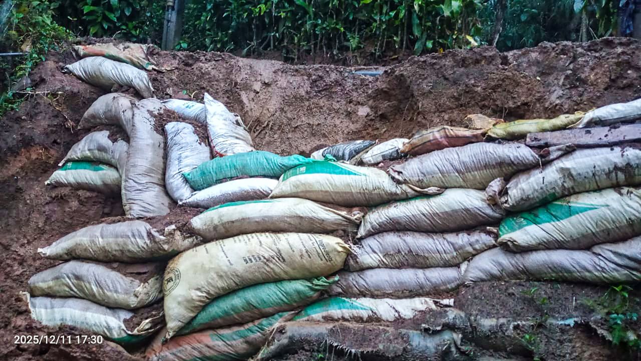 People are desperately attempting to stop landslides by using sandbags at the Stockholm Estate, Sri Lanka