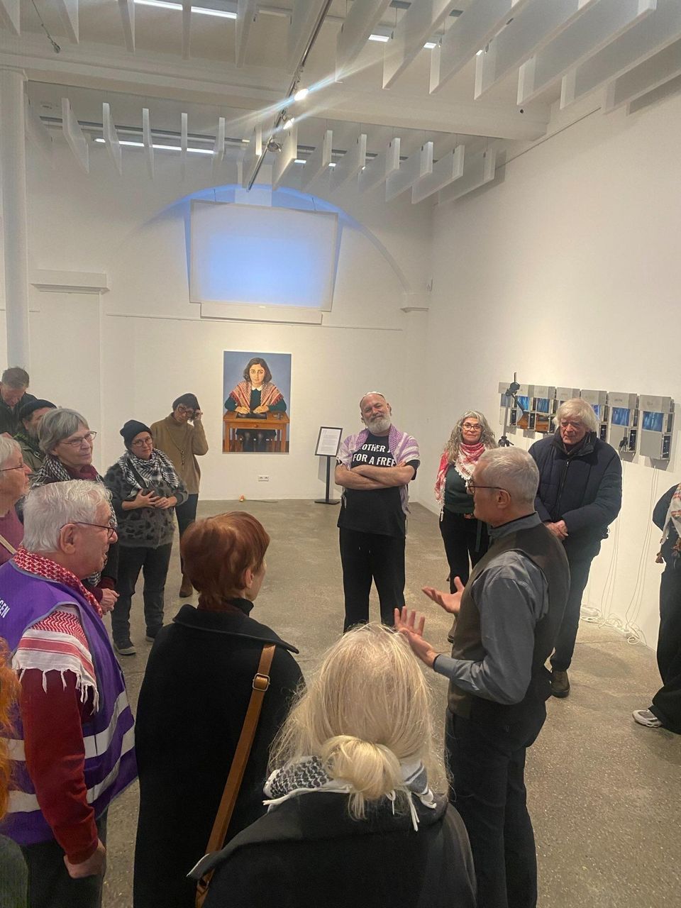 The most important new development was the visit to the exhibition on Sunday by a large delegation from the organisation Jewish Voice for a Just Peace in the Middle East. Jewish Voice is the leading organisation of Jews in Germany that has sided unequivocally with the oppressed Palestinians and denounced the genocidal policies of the Israeli government. Members of the organisation have been arrested many times by the German police for voicing their opposition to the Merz coalition government’s collaboration in the Israeli genocide. Jewish Voice has been labelled “left extremist” by the German domestic security agency (Verfassungsschutz) and has had its bank accounts annulled.