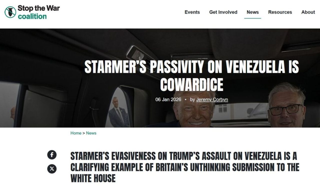 As ever, Jeremy Corbyn has been made the figurehead of the “opposition” put forward by Stop the War; his article in Tribune magazine, “Starmer’s Passivity on Venezuela is Cowardice” is republished on the STWC website. It argues in his usual handwringing fashion against “Britain’s ‘special relationship’ of unthinking submission to the White House’s interests.”