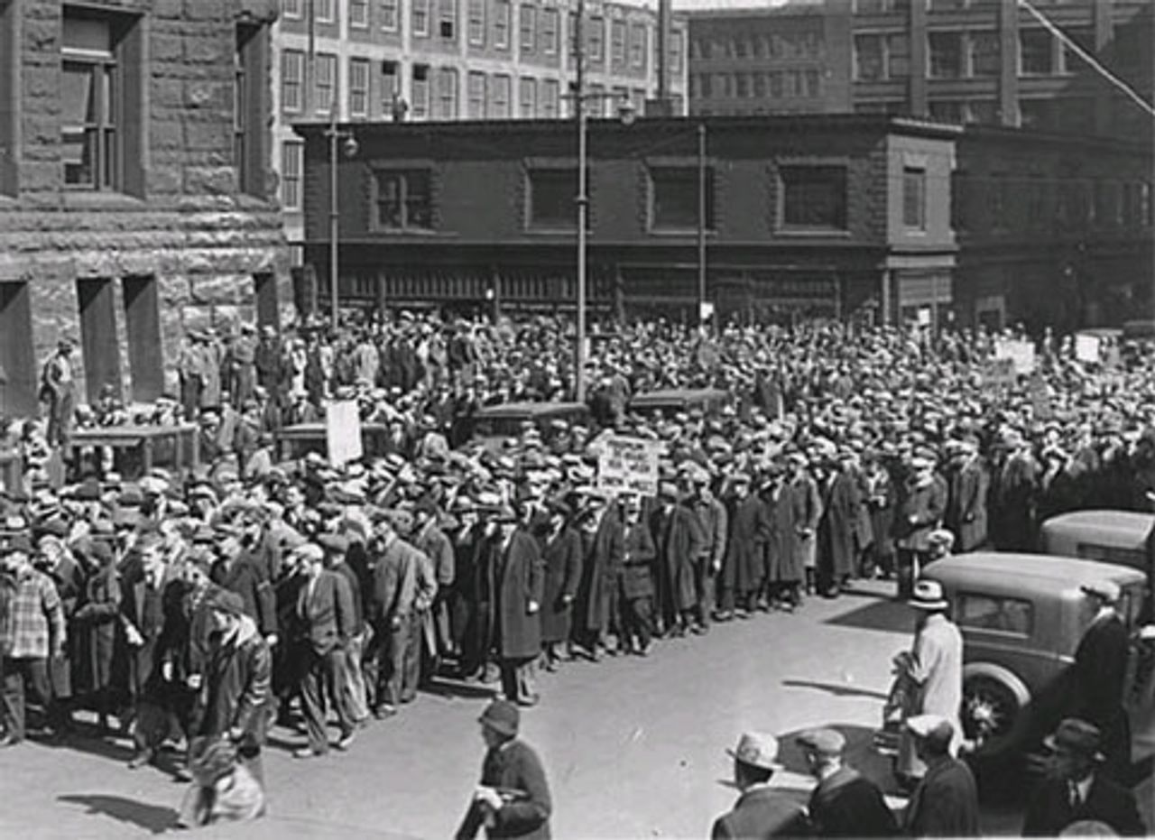 Effects of the Great Depression in Minneapolis Minnesota. Unemployed marching on City Hall to demand reinstatement of Civil Works Administration jobs, 1934.