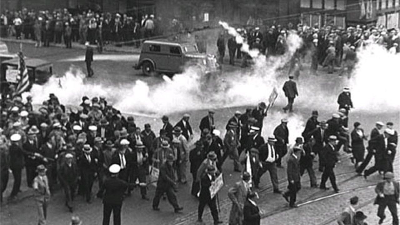 Police use tear gas against unemployed march on City Hall, Minneapolis Minnesota, 1934.