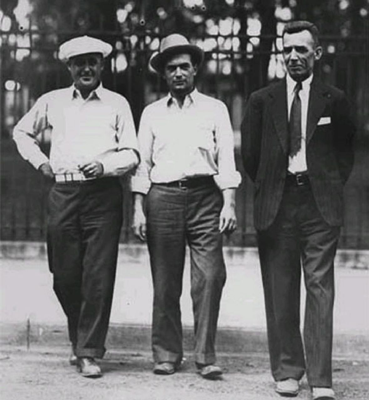 The leaders of Local 574, left to right: Grant Dunne, Bill Brown, Miles Dunne, and Vincent Dunne upon their release from the military stockade in 1934. Far right is Communist League of America lawyer Albert Goldman.
