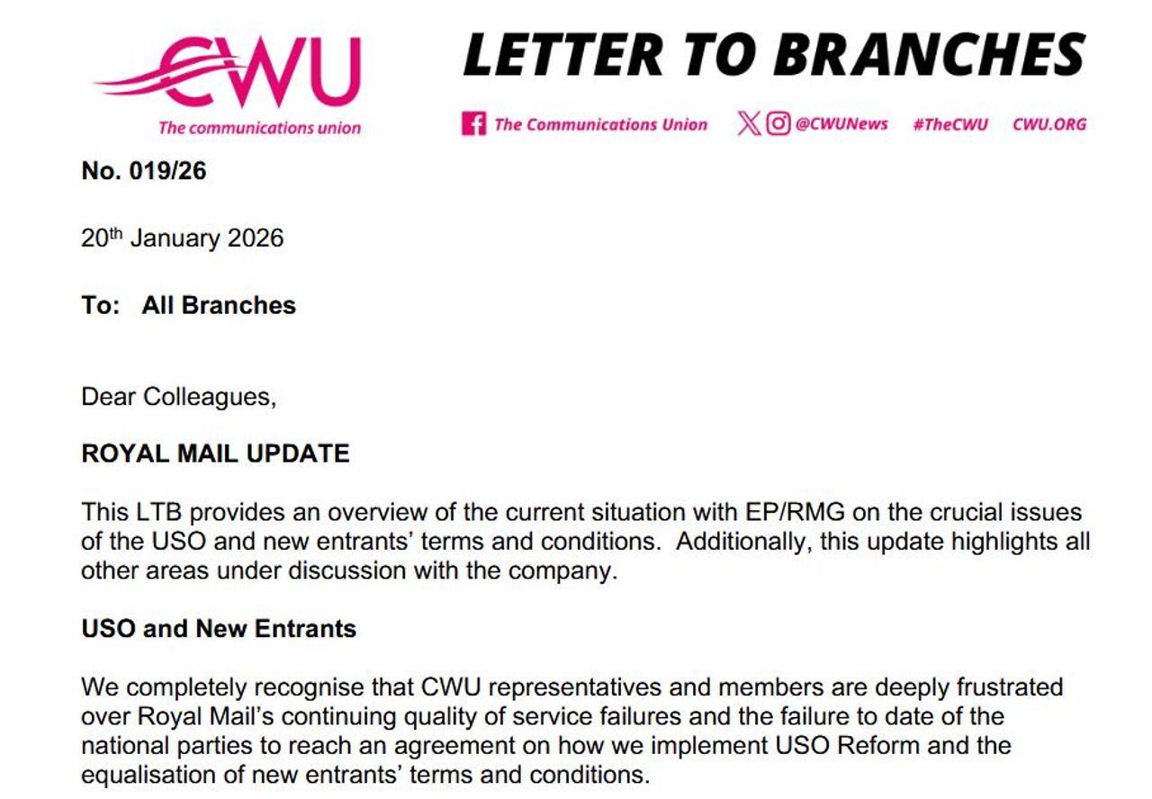 CWU's Letter to Branches, dated Kanuary 20, 2026 [Photo: CWU]