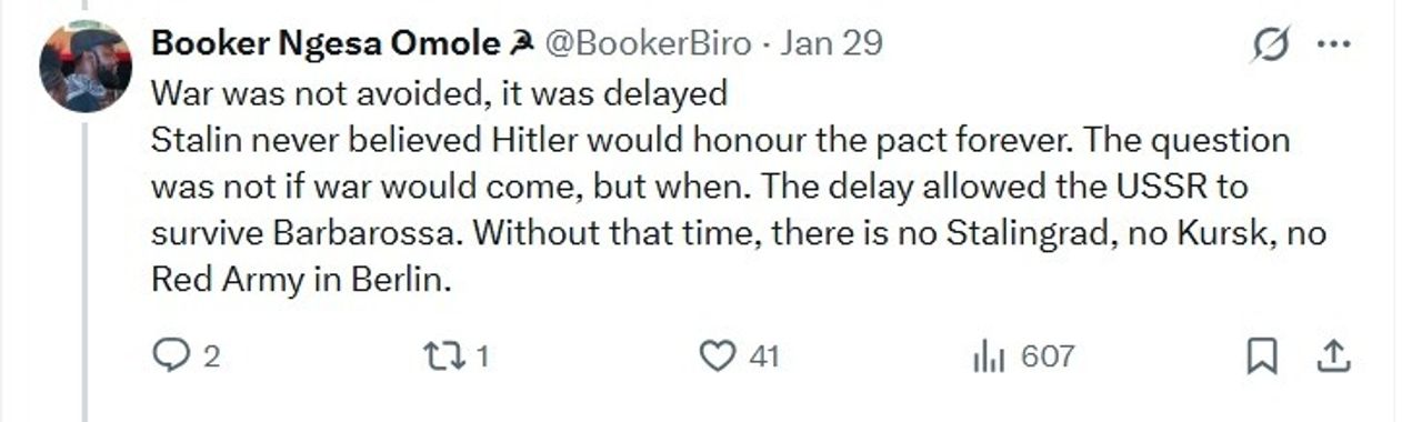 Omole’s portrayal of the Stalin–Hitler Pact as a nationalist masterstroke that defended the Soviet Union is a despicable political lie. The Stalin-Hitler Pact disoriented workers in the Soviet Union and internationally amid the eruption of Hitlerite military aggression. It came on top of Stalin’s Great Purges, a political genocide of Soviet Marxists that killed much of the top military leadership of the Red Army. This left the Soviet Union vulnerable and unprepared for the Nazi invasion when Hitler’s surprise attack came in June 1941, leading to a war in which the Soviet Union was victorious, but at the cost of a staggering 27 million Soviet lives.